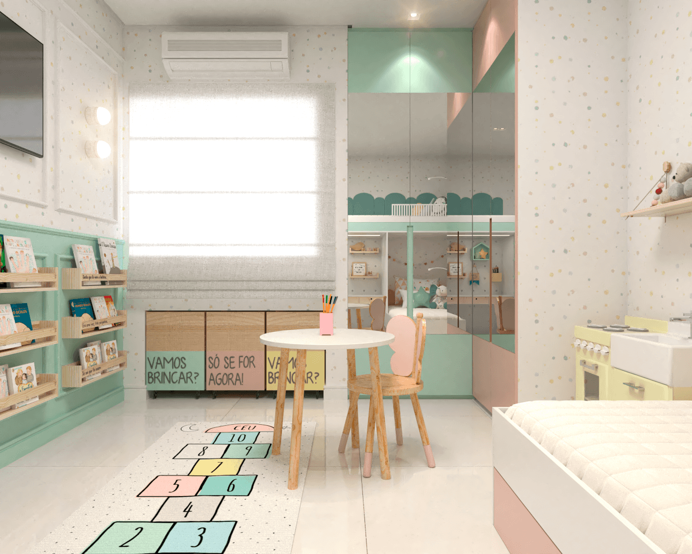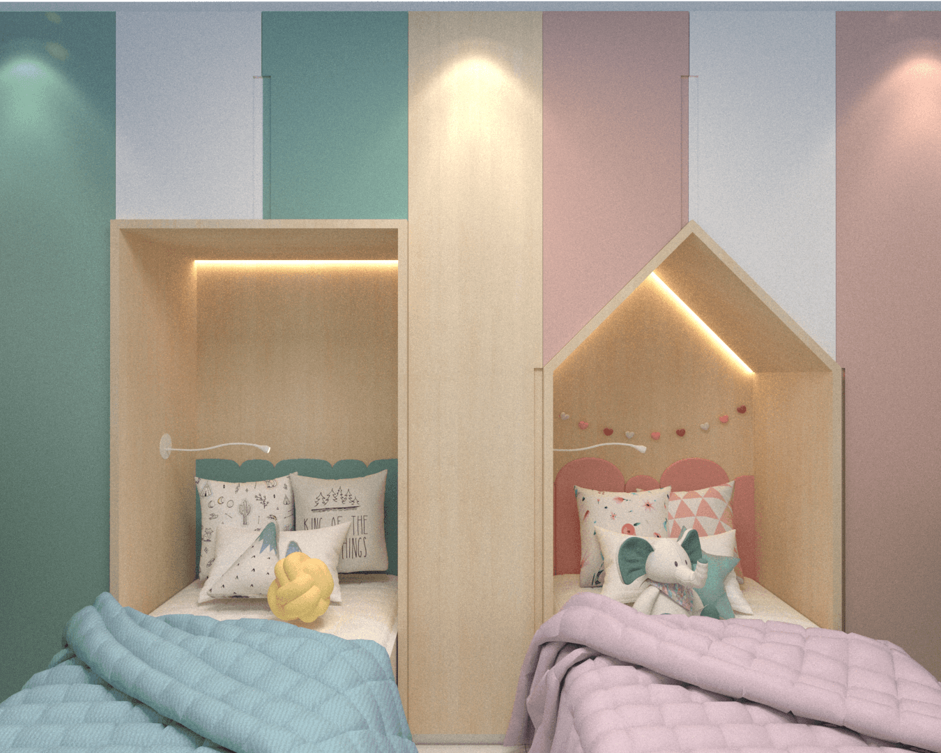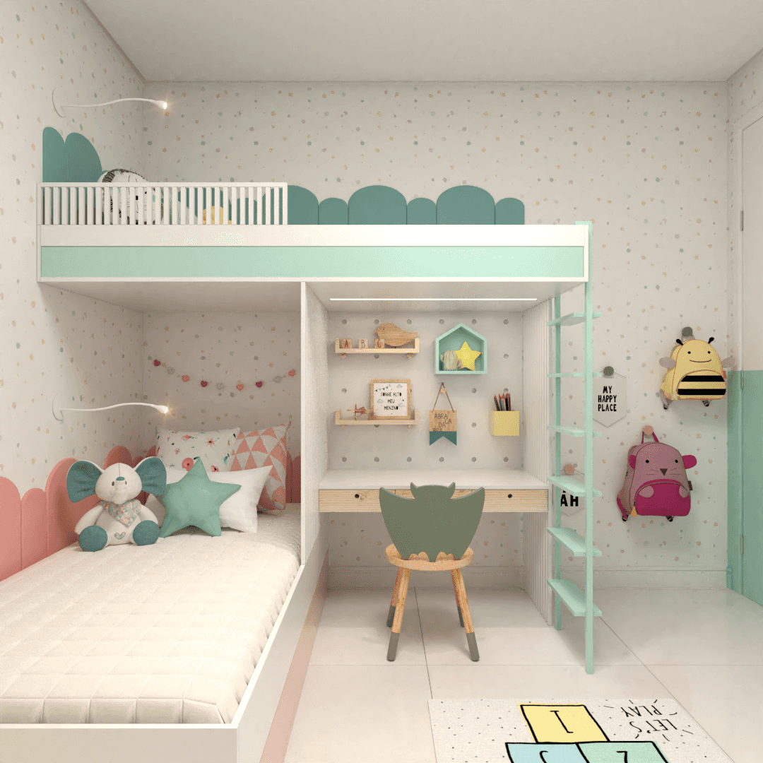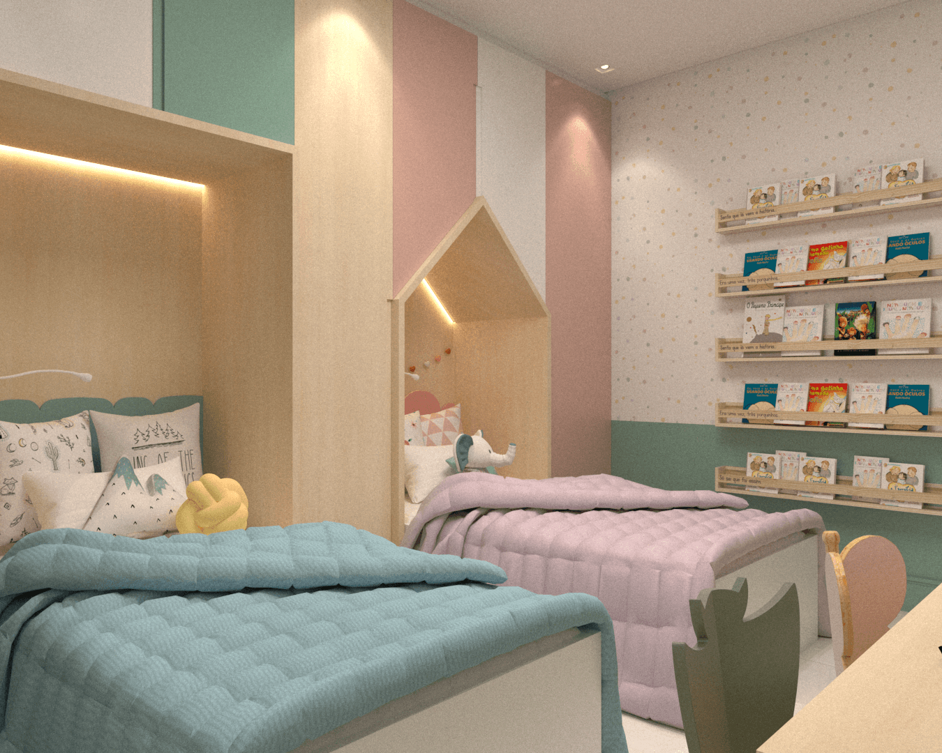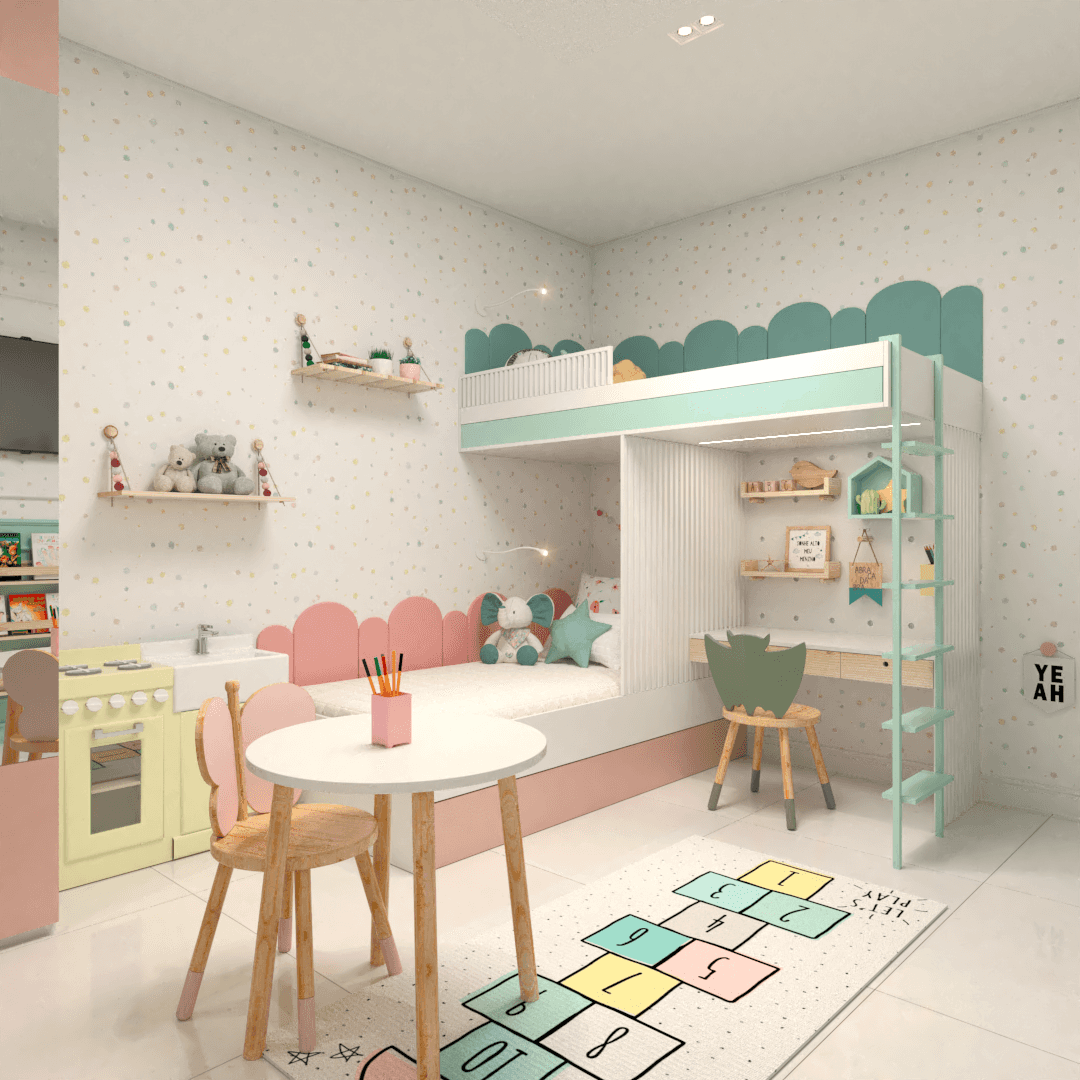 This bedroom was designed for siblings aged five and three, combining playfulness with functionality. Two layout solutions were developed to maximize space and create a sense of individuality for each child. The first option features a bunk bed to free up floor space for play, while the second includes two single beds to better accommodate their growth and changing needs over time. Both proposals aim to balance comfort, creativity, and practicality within a compact layout.