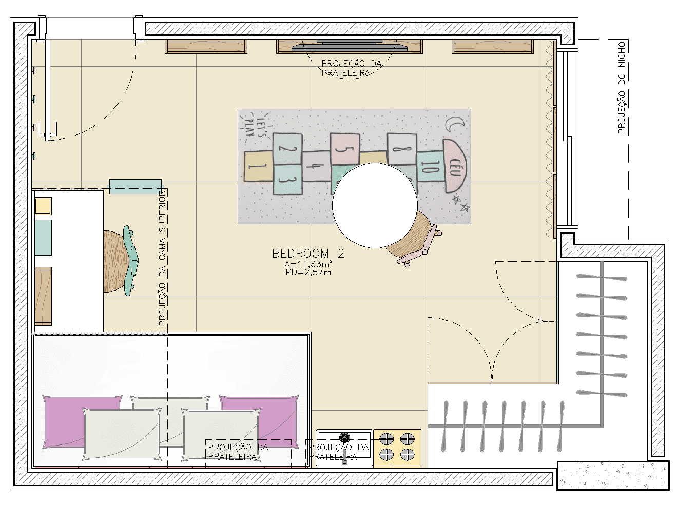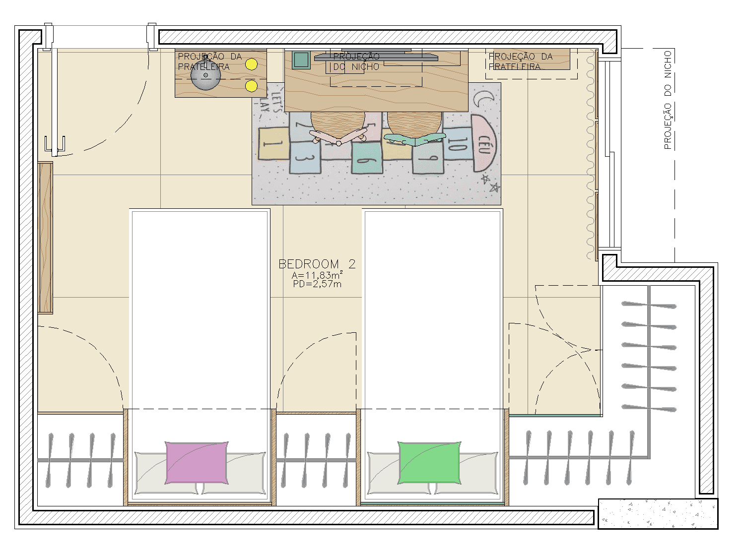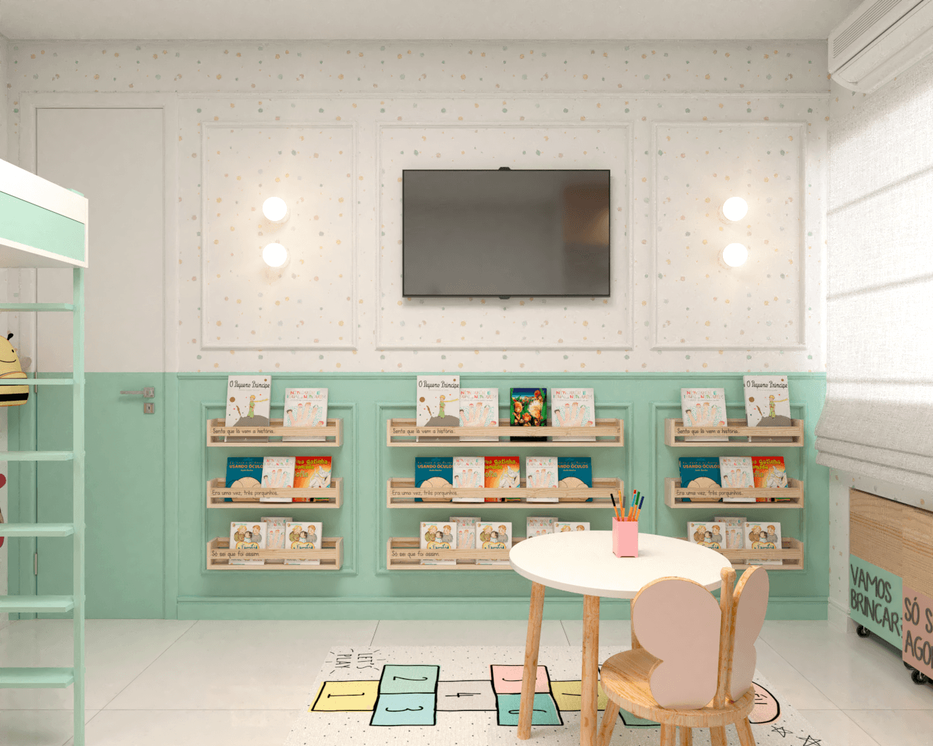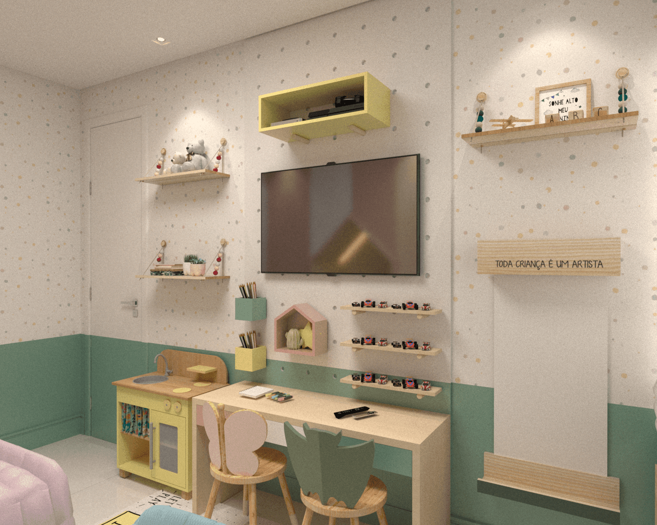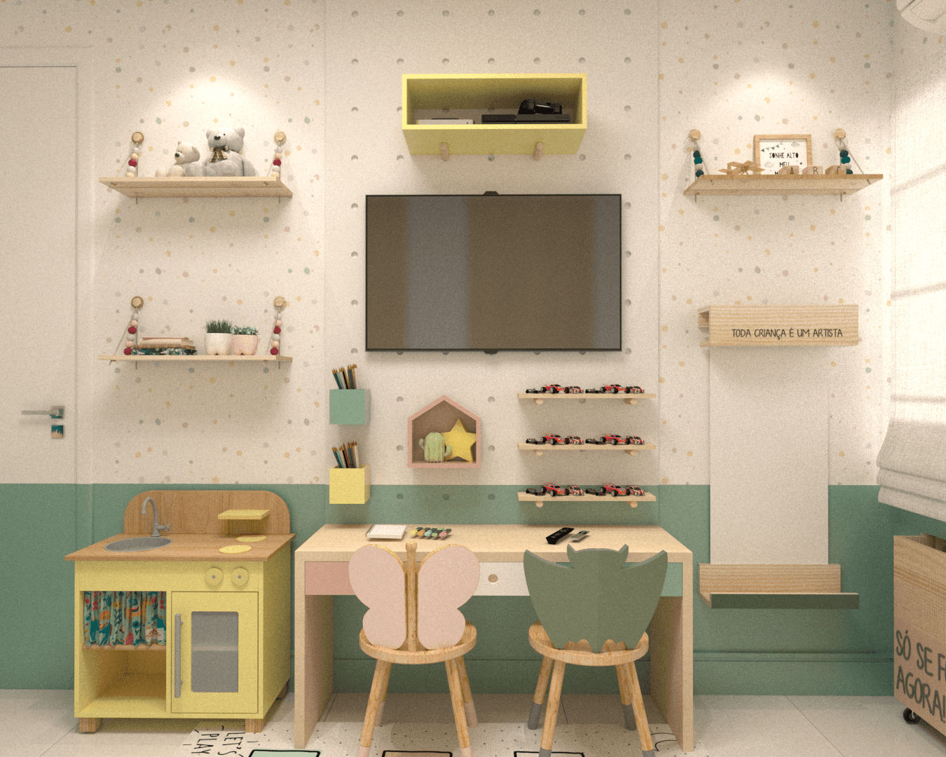 This bedroom was designed for siblings aged five and three, combining playfulness with functionality. Two layout solutions were developed to maximize space and create a sense of individuality for each child. The first option features a bunk bed to free up floor space for play, while the second includes two single beds to better accommodate their growth and changing needs over time. Both proposals aim to balance comfort, creativity, and practicality within a compact layout.
