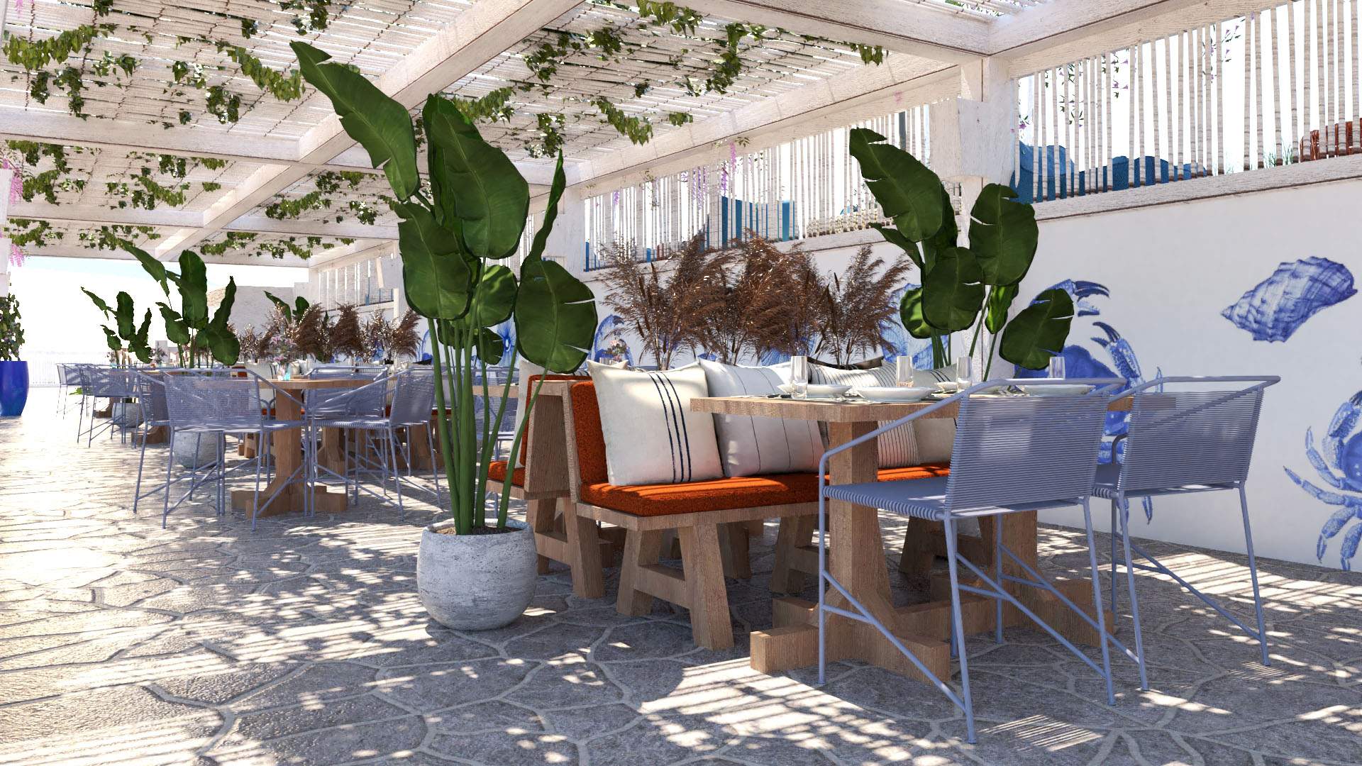 The patio offers a relaxed, beachy atmosphere without sacrificing sophistication, creating the perfect setting for a memorable dining experience.