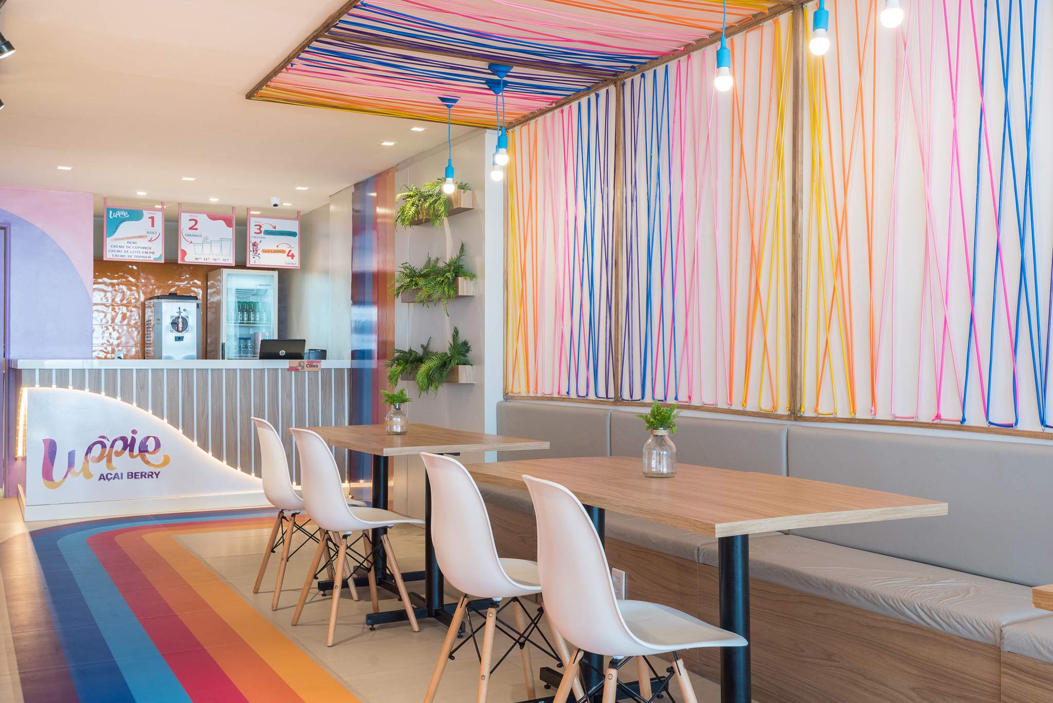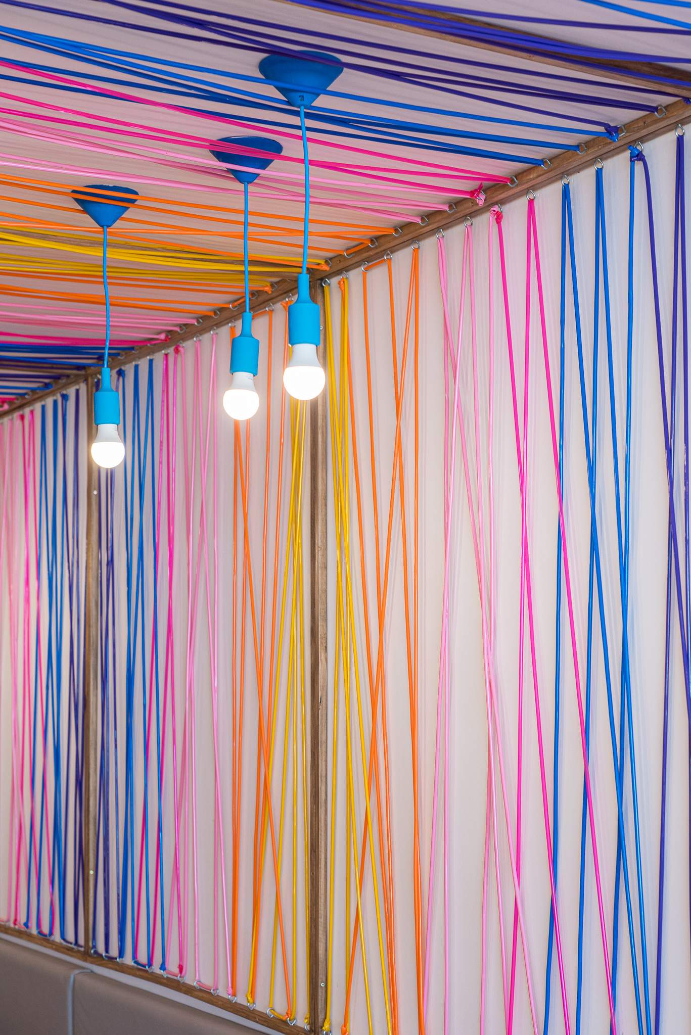 Custom wall and ceiling panels made of colourful spaghetti cords create a striking focal point, introducing rhythm and visual continuity throughout the space. Balanced by natural wood tones and soft lighting, the design achieves a cheerful and inviting atmosphere that captures the joyful essence of the brand.