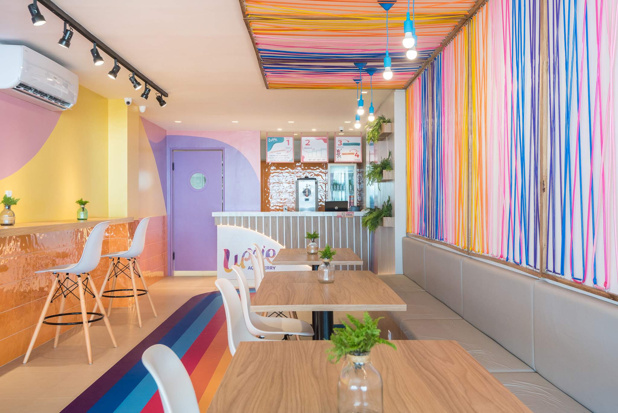 The design concept celebrates the brand’s playful identity through colour, texture, and movement. Inspired by the fluid lines of the brand’s logo, the interior features a dynamic mix of curves and bright tones.